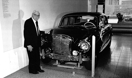 Barényi Béla met de Mercedes Benz auto waarin voor het eerst de kreukelzone werd ingebouwd. |
