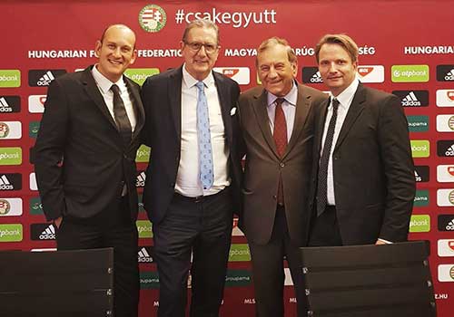Békeffi Gábor (rechts) samen met Georges Leekens, de nieuwe coach van het Hongaars nationaal elftal (oktober 2017), en Bognár Istvan (links) en Bognár György (naast Gábor). |