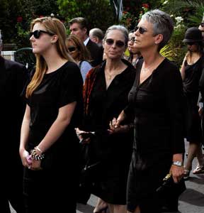 Jamie Lee Curtis met haar dochter Annie Guest en haar zuster Kelly Curtis, op de begrafenis van hun vader en grootvader Tony Curtis. |