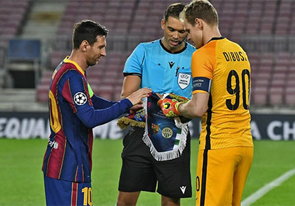 Dibusz samen met Lionel Messi aan de aftrap bij een wedstrijd van Ferencváros tegen FC Barcelona in januari 2021. |