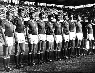 Fazekas viert aan de dwarslat het aantekenen van een doelpunt van Dunai Antal tegen Leeds United (Beker Jaarbeurssteden, 5-3-1969, Leeds United-Újpest Dózsa 0-1). |