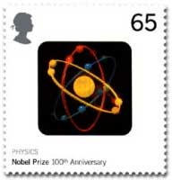 De Engelse Koninklijke Post vierde de 100ste verjaardag van de Nobelprijzen met een opmerkelijke reeks van 6 postzegels, verschenen op 2 oktober 2001. De zegel met een waarde van 65 p. had de natuurkunde als onderwerp en vertoonde een door Dennis Gabor (Nobelprijs 1971) uitgevonden hologram van een borium molecule. |