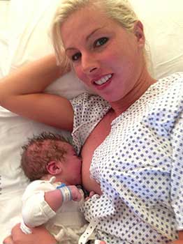 Halmosi's echtgenote Eszter met hun pas geboren zoontje Medox aan de borst in september 2013.