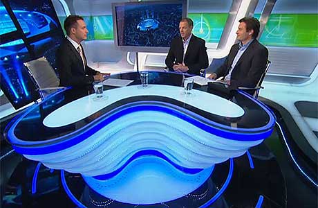 Juhár Tamás als tv-commentator (rechts op de rechter foto). |