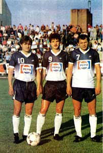 Bij Tatabánya: (van links naar rechts) Vincze István, Plotár Gyula en Kiprich József in 1987... |