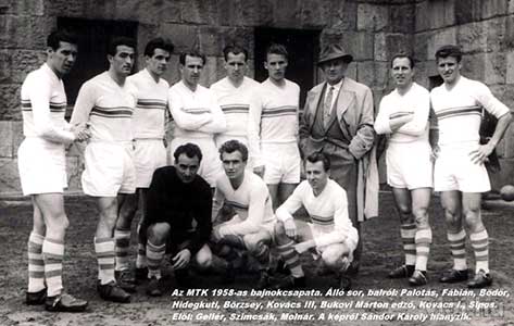 Kovacs Ferenc (3de van rechts tussen Hidegkuti Nándor en Sándor Károly) met MTK dat de finale voor de Mitropa Cup speelde in 1955. |