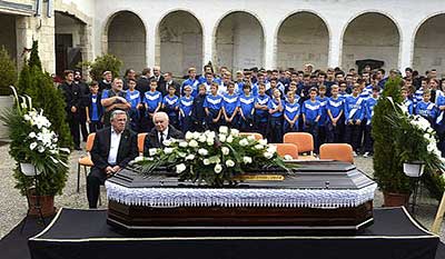 Het afscheid aan Sándor Károly op het kerkhof van Farkasréti op 3 oktober 2014, in aanwezigheid van ondermeer oud-spelers Mészöly Kálmán en Fenyvesi Máté (rechts gezeten). |