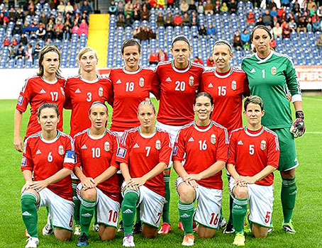De nationale ploeg van Hongarije vóór een wedstrijd, met ondermeer Szőcs Réka (1), Hummel-Smuczer Angéla (6), Vágó Fanny (10), Gál Tímea (5) en Szabó Boglárka (16). |