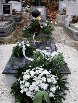 Het graf van Toldi Géza, met gedenkplaat, op het kerkhof van Farkasréti.