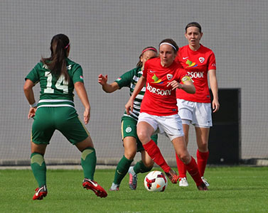 In volle actie tijdens een wedstrijd Diósgyõri VTK-Ferencvárosi TC. |