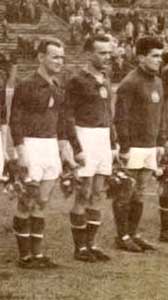 Vilezsál Oszkár tussen Dékány en Fenyvesi, bij een wedstrijd voor het Hongaars B-elftal. |