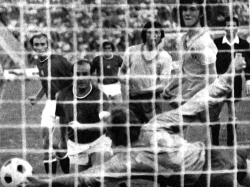 Bene Ferenc hoopte dat de bal zou binnengaan, maar de Zweedse doelman redde (wedstrijd Hongarije-Zweden van 13-6-1973, 3-3). |